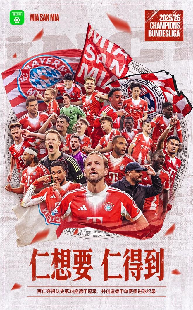 北京时间4月19日晚,德甲联赛第30轮,拜仁慕尼黑主场兵不血刃,4-2击败斯图加特,提前4轮夺得2025-26赛季的德甲冠军!